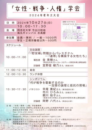 共催:同志社大学FGSSセンター、同志社大学アメリカ研究所第7部門研究「冷戦と性暴力」、科研費基盤研究B「フェミニズム理論による新たな国家論の構築-ケア概念と安全保障概念の再構想から」 (課題番号 23H03654)